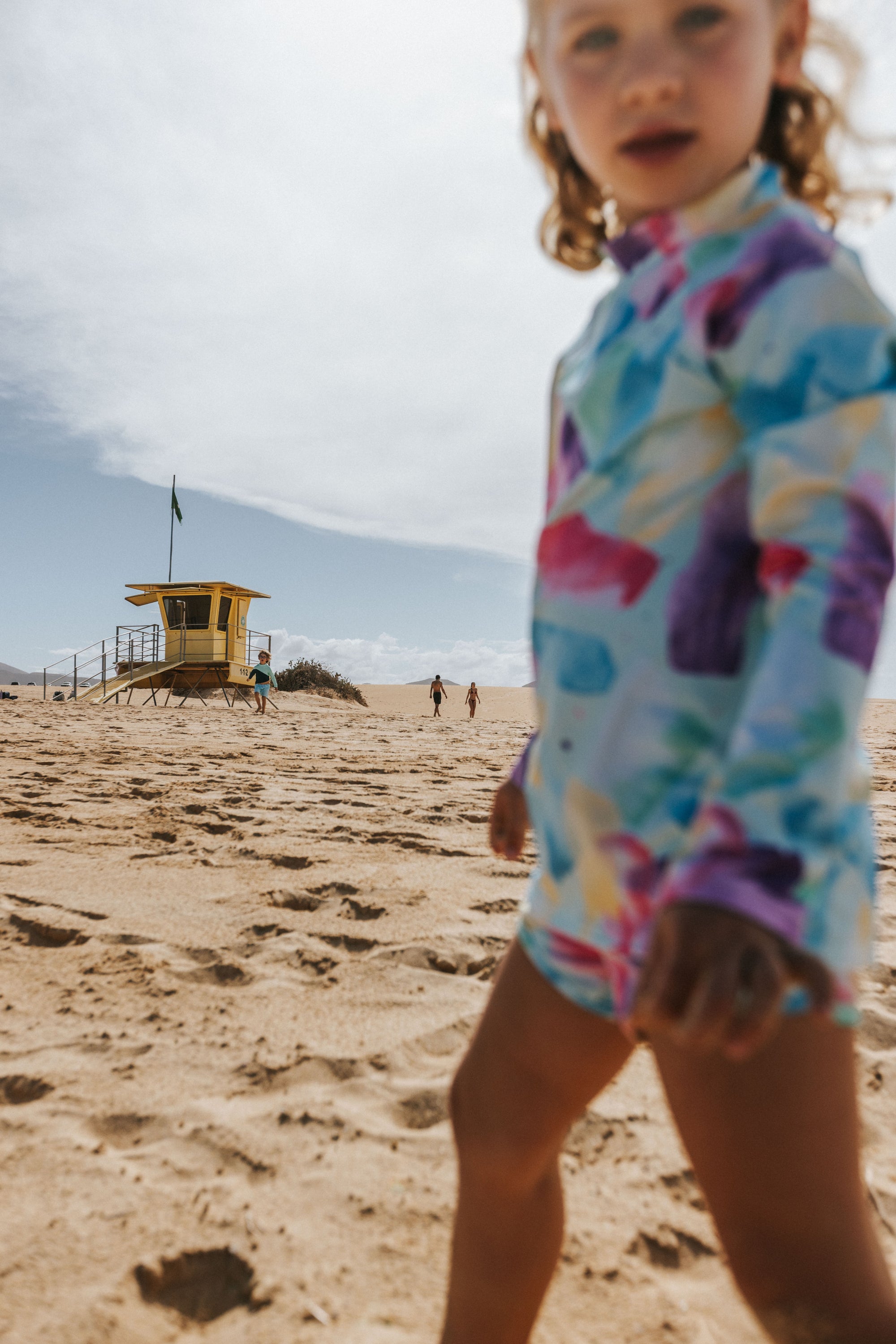 Our peach-soft UV SPF 50+ swimsuit in our vibrant Pastel Pot print provides full upper body coverage from the sun, for all day outdoor play.
