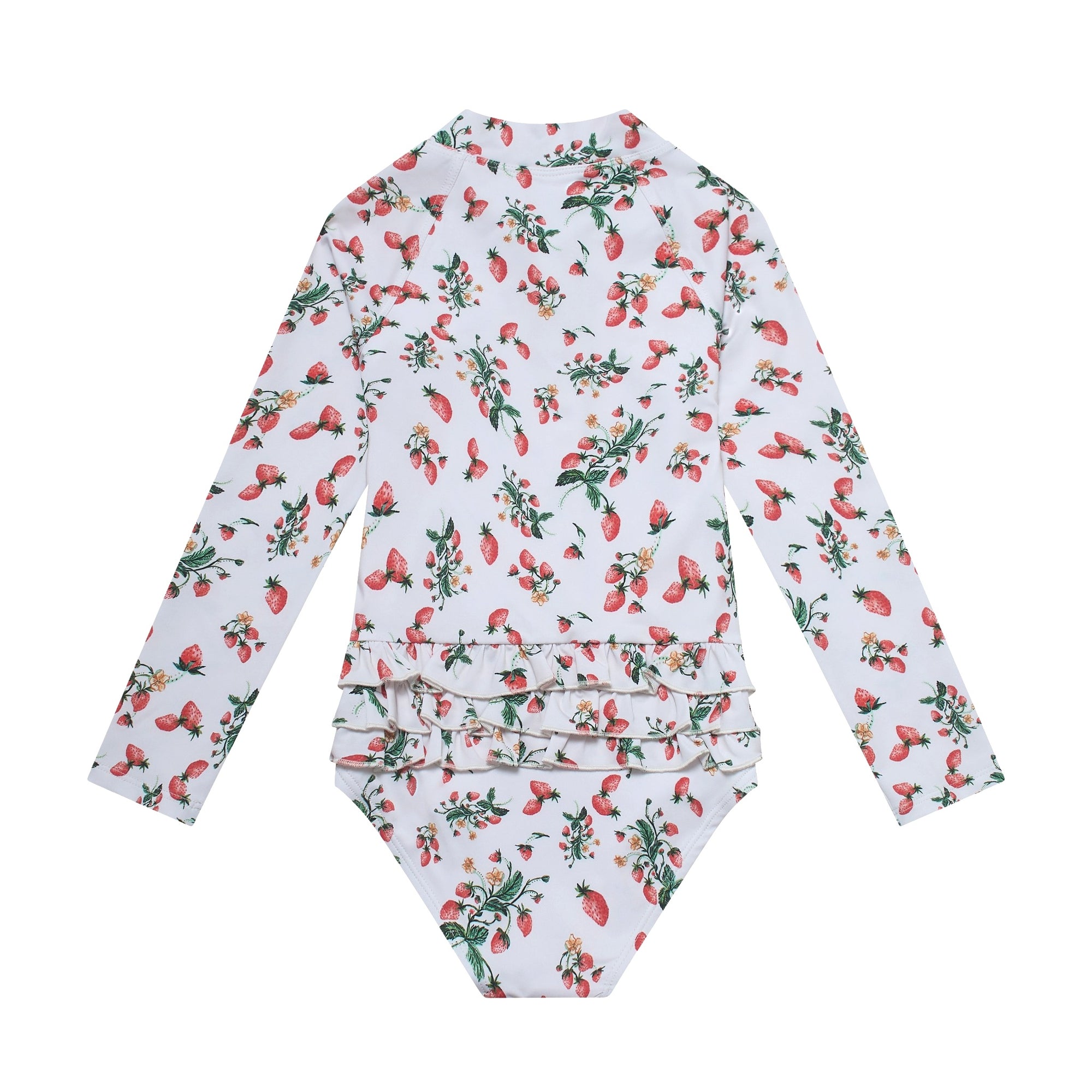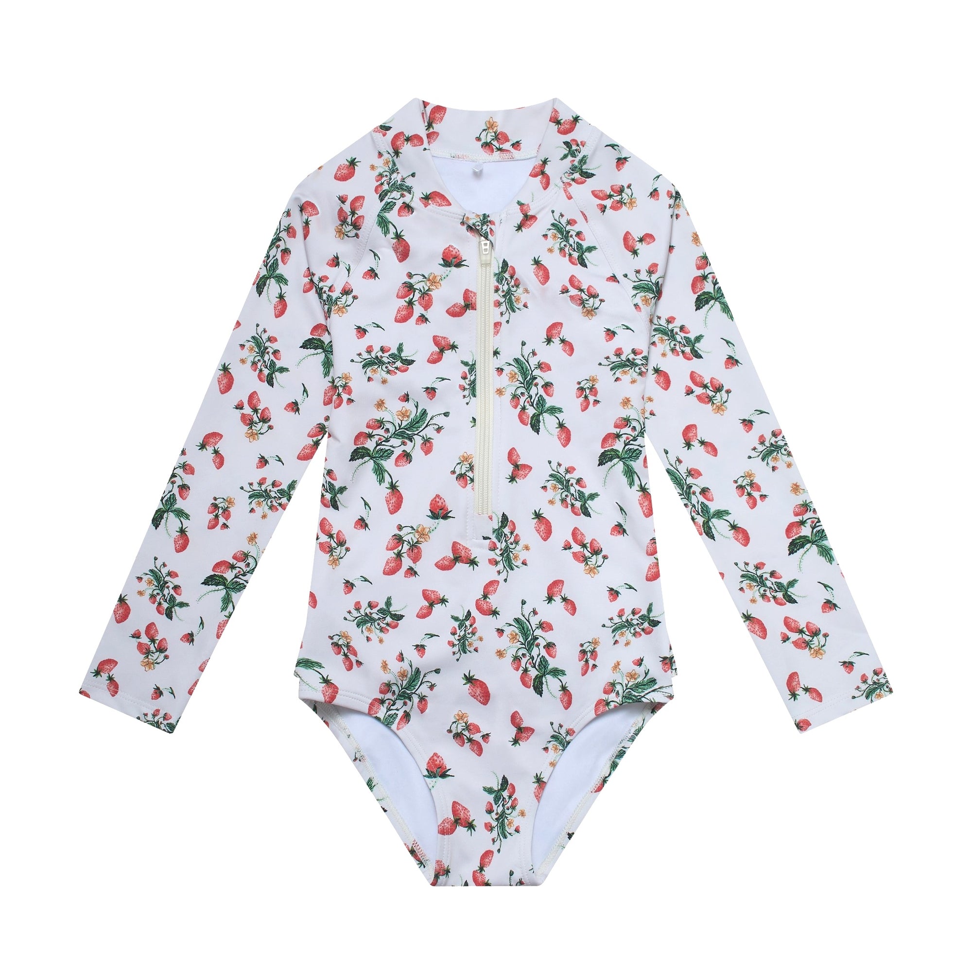 Our peach-soft UV SPF 50+ swimsuit in our strawberry fields print provides full upper body coverage from the sun, for all day outdoor play.